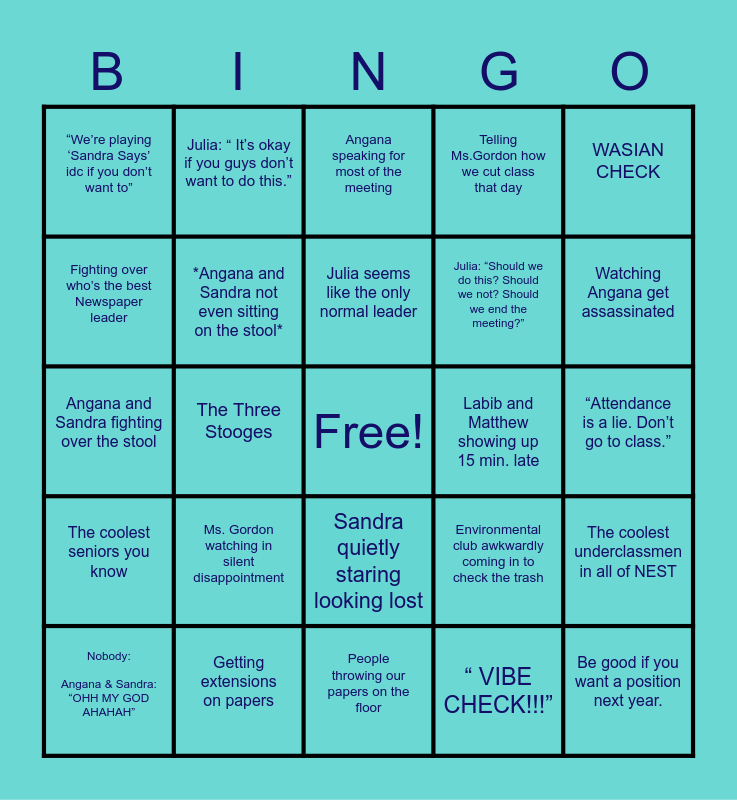This bingo card has a free space and 24 words: Nobody: Angana & Sandra: “OHH MY GOD AHAHAH”, Ms. Gordon watching in silent disappointment, Julia seems like the only normal leader, “ VIBE CHECK!!!”, WASIAN CHECK, “We’re playing ‘Sandra Says’ idc if you don’t want to”, Julia: “ It’s okay if you guys don’t want to do this.”, Angana speaking for most of the meeting, Labib and Matthew showing up 15 min. late, “Attendance is a lie. Don’t go to class.”, Angana and Sandra fighting over the stool, *Angana and Sandra not even sitting on the stool*, Environmental club awkwardly coming in to check the trash, The coolest underclassmen in all of NEST, Fighting over who’s the best Newspaper leader, Getting extensions on papers, People throwing our papers on the floor, Telling Ms.Gordon how we cut class that day, Watching Angana get assassinated, The coolest seniors you know, The Three Stooges, Sandra quietly staring looking lost, Julia: “Should we do this? Should we not? Should we end the meeting?” and Be good if you want a position next year..