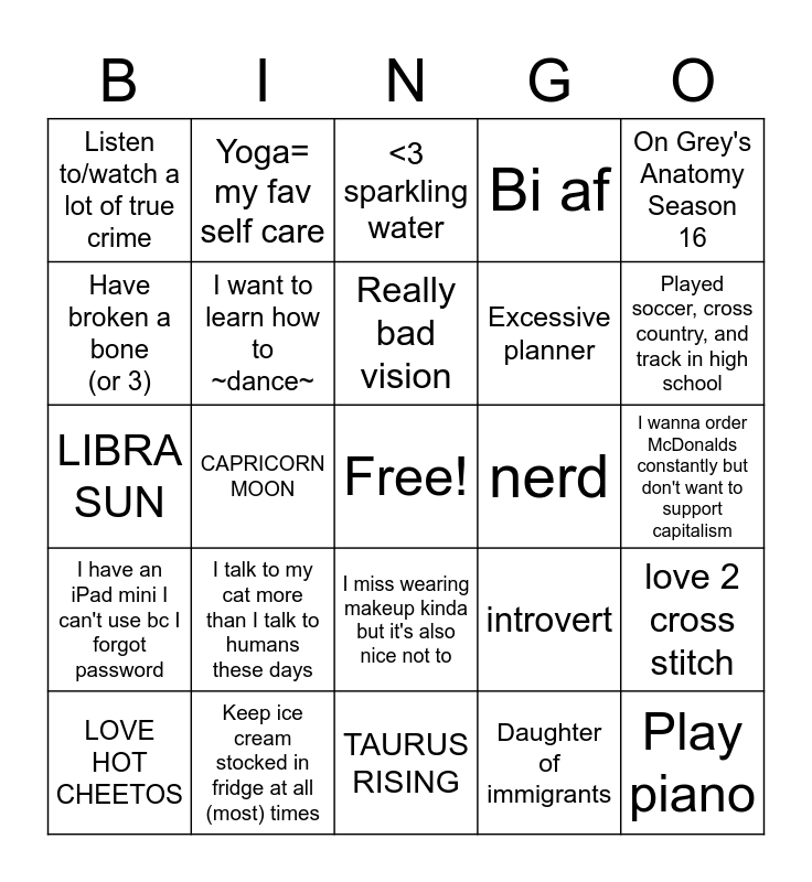 This bingo card has a free space and 24 words: I talk to my cat more than I talk to humans these days, Keep ice cream stocked in fridge at all (most) times, Really bad vision, LOVE HOT CHEETOS, On Grey's Anatomy Season 16, Listen to/watch a lot of true crime, Have broken a bone (or 3), Yoga= my fav self care, nerd, I miss wearing makeup kinda but it's also nice not to, Excessive planner, LIBRA SUN, introvert, love 2 cross stitch, I want to learn how to ~dance~, Daughter of immigrants, I wanna order McDonalds constantly but don't want to support capitalism, <3 sparkling water, Played soccer, cross country, and track in high school, CAPRICORN MOON, Play piano, I have an iPad mini I can't use bc I forgot password, Bi af and TAURUS RISING.