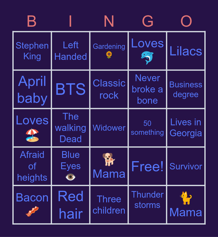 This bingo card has 25 words: Blue Eyes 👁️, Three children, Classic rock, Bacon 🥓, Lilacs, Stephen King, April baby, Left Handed, 50 something, 🐕 Mama, Never broke a bone, Loves 🏖️, Free!, Survivor, BTS, 🐈 Mama, Lives in Georgia, Gardening 🌻, Business degree, The walking Dead, Widower, Red hair, Afraid of heights, Loves 🐬 and Thunder storms.