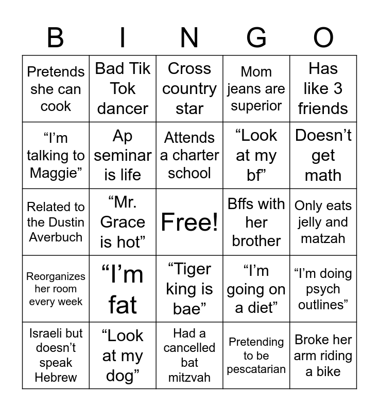 This bingo card has a free space and 24 words: “I’m fat, “Look at my dog”, Attends a charter school, Israeli but doesn’t speak Hebrew, Has like 3 friends, Pretends she can cook, “I’m talking to Maggie”, Bad Tik Tok dancer, Bffs with her brother, “Tiger king is bae”, “Look at my bf”, Related to the Dustin Averbuch, “I’m going on a diet”, “I’m doing psych outlines”, Ap seminar is life, Pretending to be pescatarian, Only eats jelly and matzah, Cross country star, Doesn’t get math, “Mr. Grace is hot”, Broke her arm riding a bike, Reorganizes her room every week, Mom jeans are superior and Had a cancelled bat mitzvah.