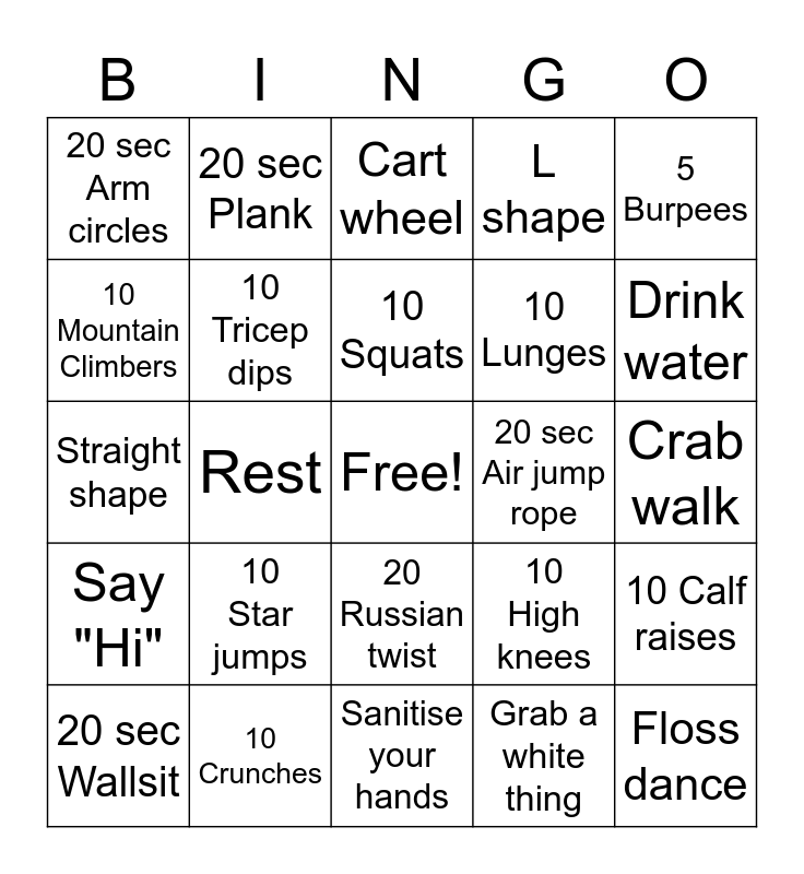 This bingo card has a free space and 24 words: 10 Star jumps, 10 Crunches, 10 Squats, 20 sec Wallsit, 5 Burpees, 20 sec Arm circles, 10 Mountain Climbers, 20 sec Plank, 20 sec Air jump rope, 20 Russian twist, 10 Lunges, Straight shape, 10 High knees, 10 Calf raises, 10 Tricep dips, Grab a white thing, Crab walk, Cart wheel, Drink water, Rest, Floss dance, Say "Hi", L shape and Sanitise your hands.