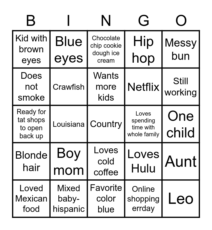 This bingo card has 25 words: Boy mom, Favorite color blue, Wants more kids, Loved Mexican food, Messy bun, Kid with brown eyes, Does not smoke, Blue eyes, Loves spending time with whole family, Loves cold coffee, Netflix, Ready for tat shops to open back up, Loves Hulu, Aunt, Crawfish, Leo, One child, Chocolate chip cookie dough ice cream, Still working, Louisiana, Country, Mixed baby-hispanic, Blonde hair, Hip hop and Online shopping errday.