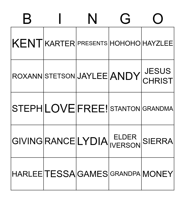 This bingo card has a free space and 24 words: RANCE, TESSA, JAYLEE, HARLEE, HAYZLEE, KENT, ROXANN, KARTER, STANTON, LYDIA, ANDY, STEPH, ELDER IVERSON, SIERRA, STETSON, GRANDPA, GRANDMA, PRESENTS, JESUS CHRIST, LOVE, MONEY, GIVING, HOHOHO and GAMES.