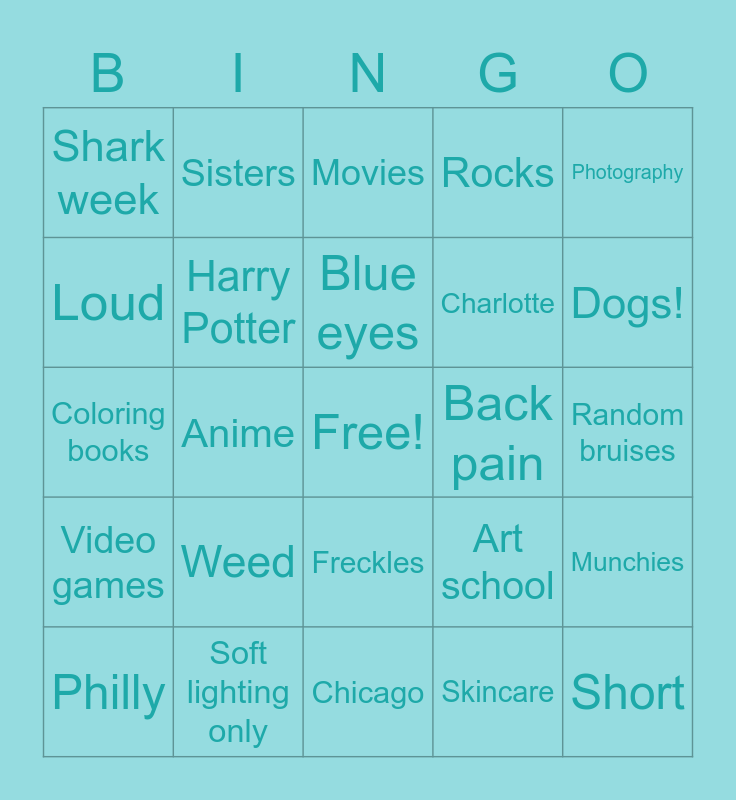 This bingo card has a free space and 24 words: Weed, Soft lighting only, Blue eyes, Philly, Photography, Shark week, Loud, Sisters, Back pain, Freckles, Charlotte, Coloring books, Art school, Munchies, Harry Potter, Skincare, Random bruises, Movies, Dogs!, Anime, Short, Video games, Rocks and Chicago.