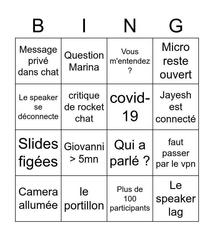 This bingo card has 18 words: Giovanni > 5mn, Le speaker lag, Vous m'entendez ?, Message privé dans chat, Qui a parlé ?, Micro reste ouvert, Camera allumée, Question Marina, Jayesh est connecté, Slides figées, Plus de 100 participants, Le speaker se déconnecte, faut passer par le vpn, critique de rocket chat, covid-19, Monique parle de sécurité, le portillon and le 11 mai.