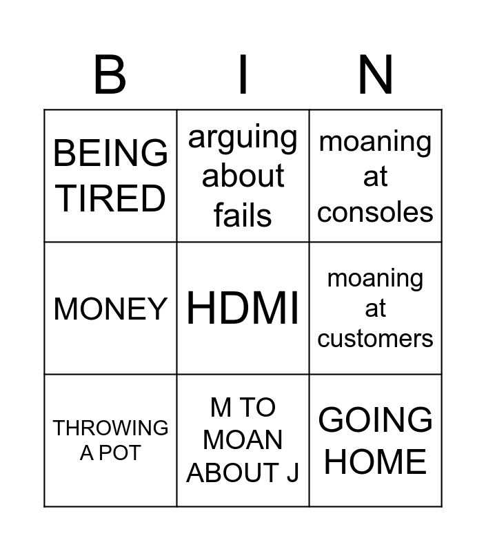 This bingo card has a free space and 8 words: moaning at customers, moaning at consoles, arguing about fails, THROWING A POT, BEING TIRED, GOING HOME, MONEY and M TO MOAN ABOUT J.