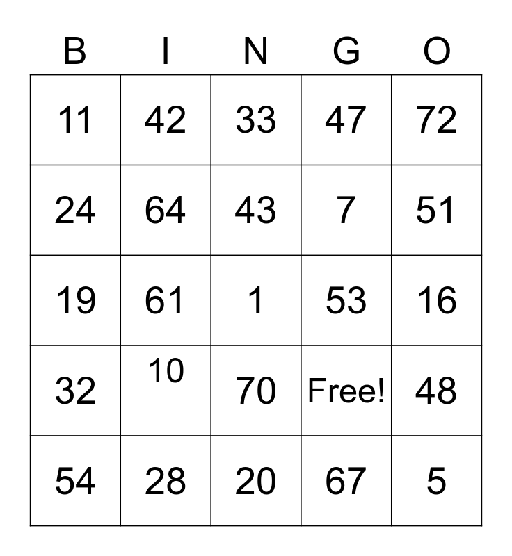 This bingo card has 25 words: 10, 20, 43, 54, 72, 11, 24, 42, 53, 70, 7, 19, Free!, 48, 64, 5, 16, 33, 51, 61, 1, 28, 32, 47 and 67.