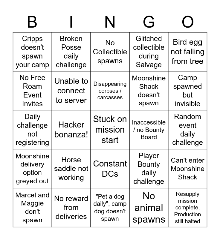 This bingo card has a free space and 24 words: Horse saddle not working, No reward from deliveries, Disappearing corpses / carcasses, Marcel and Maggie don't spawn, Bird egg not falling from tree, Cripps doesn't spawn your camp, No Free Roam Event Invites, Broken Posse daily challenge, Inaccessible / no Bounty Board, Constant DCs, Moonshine Shack doesn't spawn, Daily challenge not registering, Player Bounty daily challenge, Can't enter Moonshine Shack, Unable to connect to server, No animal spawns, Random event daily challenge, No Collectible spawns, Camp spawned but invisible, Hacker bonanza!, Resupply mission complete, Production still halted, Moonshine delivery option greyed out, Glitched collectible during Salvage and "Pet a dog daily", camp dog doesn't spawn.