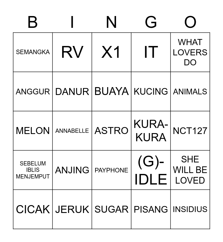 This bingo card has a free space and 24 words: ANJING, JERUK, BUAYA, CICAK, WHAT LOVERS DO, SEMANGKA, ANGGUR, RV, KURA-KURA, PAYPHONE, KUCING, MELON, (G)-IDLE, SHE WILL BE LOVED, DANUR, PISANG, NCT127, X1, ANIMALS, ANNABELLE, INSIDIUS, SEBELUM IBLIS MENJEMPUT, IT and SUGAR.
