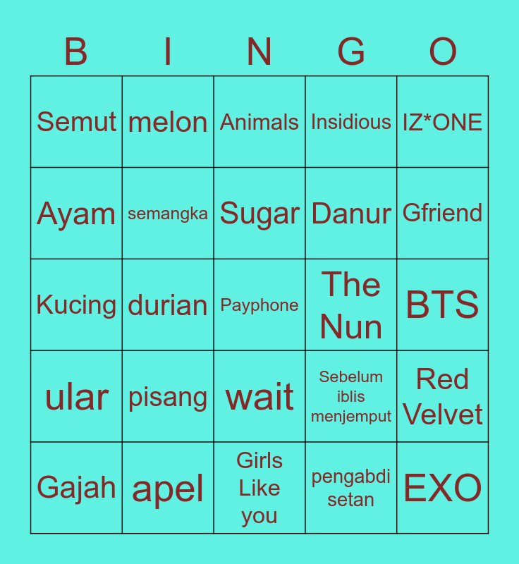 This bingo card has a free space and 24 words: Gajah, pisang, Sugar, pengabdi setan, IZ*ONE, Semut, melon, Animals, The Nun, BTS, Kucing, semangka, Sebelum iblis menjemput, Red Velvet, Ayam, apel, Girls Like you, Insidious, Gfriend, ular, durian, wait, Danur and EXO.