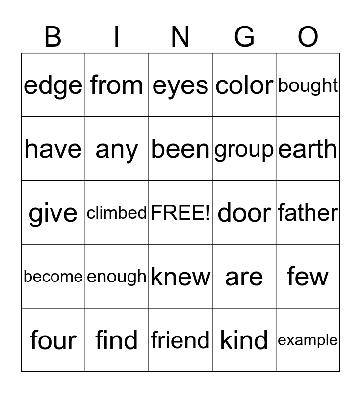 This bingo card has a free space and 36 words: again, although, answer, any, are, become, been, both, bought, catch, climbed, color, does, door, earth, edge, eight, enough, example, eyes, father, few, find, four, friend, from, give, great, group, have, heard, island, kind, knew, know and learn.