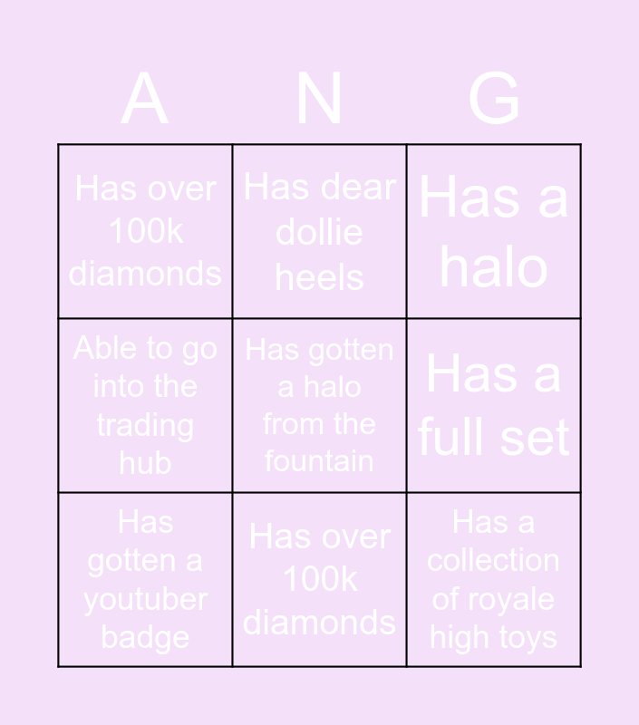This bingo card has a free space and 8 words: Has a full set, Has a halo, Has dear dollie heels, Has gotten a youtuber badge, Has over 100k diamonds, Has a collection of royale high toys, Able to go into the trading hub and Has over 100k diamonds.