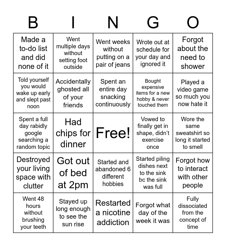 This bingo card has a free space and 24 words: Got out of bed at 2pm, Stayed up long enough to see the sun rise, Spent an entire day snacking continuously, Went 48 hours without brushing your teeth, Forgot about the need to shower, Made a to-do list and did none of it, Told yourself you would wake up early and slept past noon, Went multiple days without setting foot outside, Vowed to finally get in shape, didn’t exercise once, Started and abandoned 6 different hobbies, Bought expensive items for a new hobby & never touched them, Spent a full day rabidly google searching a random topic, Started piling dishes next to the sink bc the sink was full, Forgot how to interact with other people, Accidentally ghosted all of your friends, Forgot what day of the week it was, Wore the same sweatshirt so long it started to smell, Went weeks without putting on a pair of jeans, Played a video game so much you now hate it, Had chips for dinner, Fully dissociated from the concept of time, Destroyed your living space with clutter, Wrote out at schedule for your day and ignored it and Restarted a nicotine addiction.