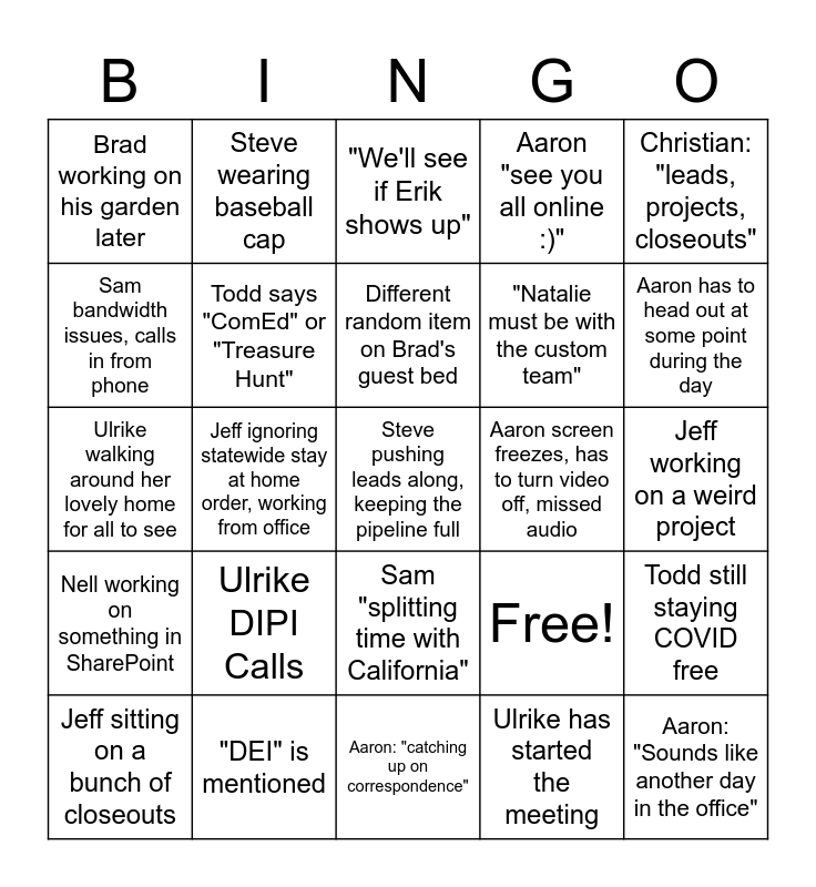 This bingo card has 25 words: Ulrike DIPI Calls, Aaron: "catching up on correspondence", Different random item on Brad's guest bed, Jeff sitting on a bunch of closeouts, Christian: "leads, projects, closeouts", Brad working on his garden later, Sam bandwidth issues, calls in from phone, Steve wearing baseball cap, Aaron screen freezes, has to turn video off, missed audio, Sam "splitting time with California", "Natalie must be with the custom team", Ulrike walking around her lovely home for all to see, Free!, Todd still staying COVID free, Todd says "ComEd" or "Treasure Hunt", Aaron: "Sounds like another day in the office", Jeff working on a weird project, "We'll see if Erik shows up", Aaron has to head out at some point during the day, Jeff ignoring statewide stay at home order, working from office, Steve pushing leads along, keeping the pipeline full, "DEI" is mentioned, Nell working on something in SharePoint, Aaron "see you all online :)" and Ulrike has started the meeting.