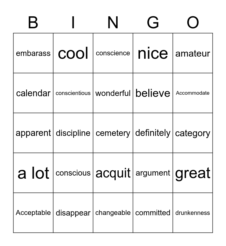 This bingo card has 29 words: Acceptable, Accidentally, discipline, drunkenness, embarass, conscience, conscientious, conscious, definitely, disappear, category, cemetery, changeable, committed, Accommodate, Acquire, acquit, a lot, amateur, apparent, argument, atheist, believe, calendar, nice, cool, great, wonderful and fantastic.
