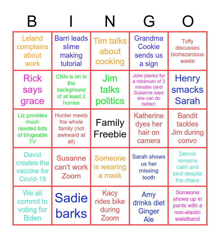 This bingo card has a free space and 24 words: Susanne can't work Zoom, Sadie barks, Jim talks politics, We all commit to voting for Biden, Tuffy discusses biohazardous waste, Leland complains about work, Rick says grace, Barri leads slime making tutorial, Katherine dyes her hair on camera, Someone is wearing a mask, John planks for a minimum of 3 minutes (and Susanne says she can do better), Liz provides much needed lists of bingeable TV, Sarah shows us her missing tooth, Dennis remains calm and kind despite the chaos, CNN is on in the background of at least 2 homes, Amy drinks diet Ginger Ale, Bandit tackles Jim during convo, Tim talks about cooking, Henry smacks Sarah, Hunter meets the whole family (not awkward at all), Someone shows up in pants with a non-elastic waistband, David creates the vaccine for Covid-19, Grandma Cookie sends us a sign and Kacy rides bike during Zoom.