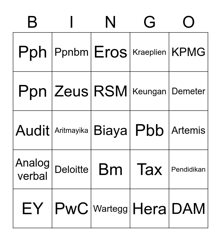 This bingo card has a free space and 24 words: Deloitte, PwC, RSM, EY, KPMG, Pph, Ppn, Ppnbm, Pbb, Bm, Keungan, Audit, Tax, Pendidikan, Zeus, Hera, Artemis, Eros, Demeter, Aritmayika, DAM, Analog verbal, Kraeplien and Wartegg.