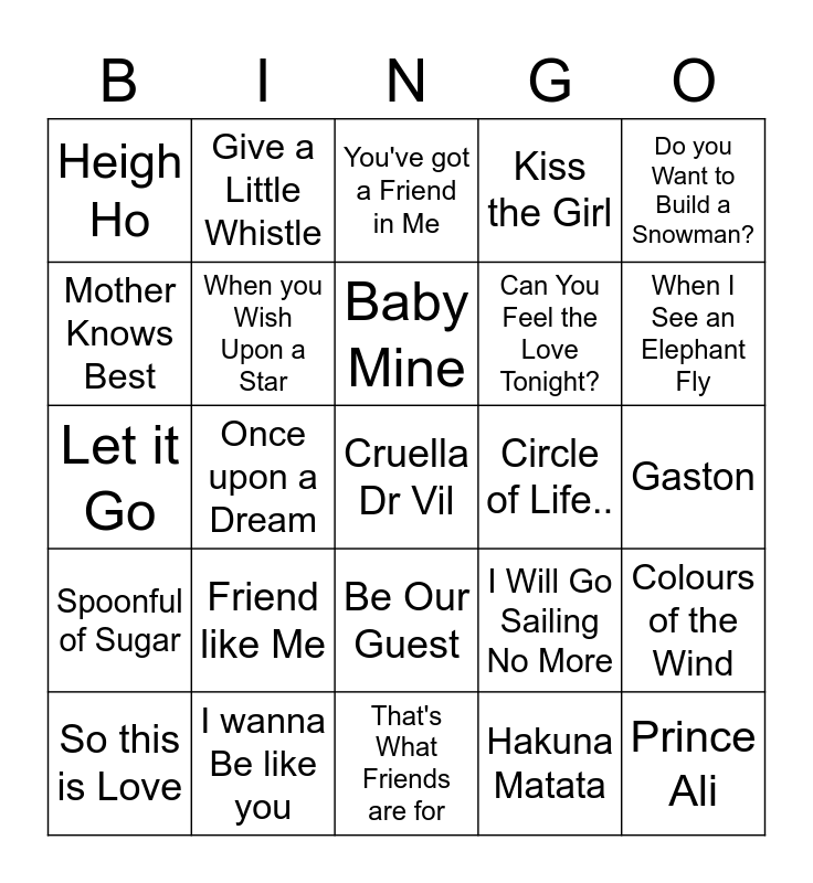 This bingo card has 40 words: Part of your World, Let it Go, Chimcher-ee, When you Wish Upon a Star, I wanna Be like you, Be Our Guest, Baby Mine, A Whole New World, Do you Want to Build a Snowman?, Spoonful of Sugar, Once upon a Dream, Kiss the Girl, Cruella Dr Vil, Gaston, Circle of Life.., Friend like Me, Poor Unfortunate Souls, Heigh Ho, He's a Tramp., You've got a Friend in Me, Colours of the Wind, Hakuna Matata, Can You Feel the Love Tonight?, Mother Knows Best, I Just Can't Wait to be King, I'll Make a Man Out of You, Under the Sea, When Will my Life Begin?, Prince Ali, Beauty and the Beast, Honour to Us All, So this is Love, Strange Things, I Will Go Sailing No More, When I See an Elephant Fly, That's What Friends are for, Hi Diddle Dee Dee, I Got No Strings, Give a Little Whistle and YodelSong.