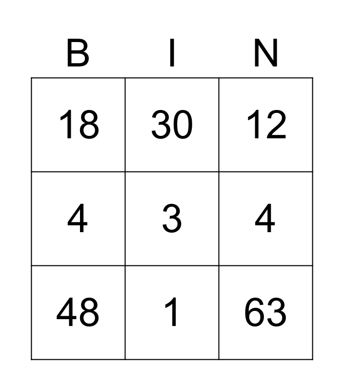 This bingo card has a free space and 8 words: 4, 12, 30, 48, 18, 63, 4 and 1.