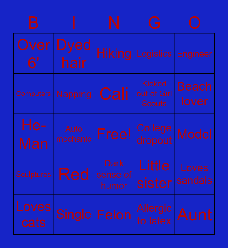This bingo card has a free space and 24 words: Red, Single, Cali, Loves cats, Engineer, Over 6', Computers, Dyed hair, College dropout, Dark sense of humor, Kicked out of Girl Scouts, He-Man, Little sister, Loves sandals, Napping, Allergic to latex, Model, Hiking, Beach lover, Auto mechanic, Aunt, Sculptures, Logistics and Felon.