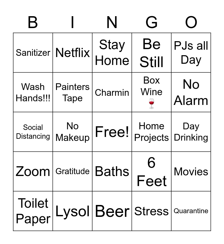 This bingo card has a free space and 24 words: Gratitude, Lysol, Charmin, Toilet Paper, PJs all Day, Sanitizer, Wash Hands!!!, Netflix, Home Projects, Baths, Box Wine 🍷, Social Distancing, 6 Feet, Movies, Painters Tape, Stress, Day Drinking, Stay Home, No Alarm, No Makeup, Quarantine, Zoom, Be Still and Beer.