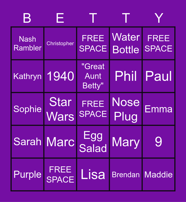 This bingo card has a free space and 29 words: FREE SPACE, FREE SPACE, FREE SPACE, FREE SPACE, FREE SPACE, Nash Rambler, 1940, "Great Aunt Betty", Nose Plug, 9, Purple, Star Wars, Brendan, Maddie, Sophie, Delaney, Lisa, Mary, Paul, Sarah, Marc, Janel, Phil, Emma, Kathryn, Christopher, Egg Salad, Water Bottle and Laptop.