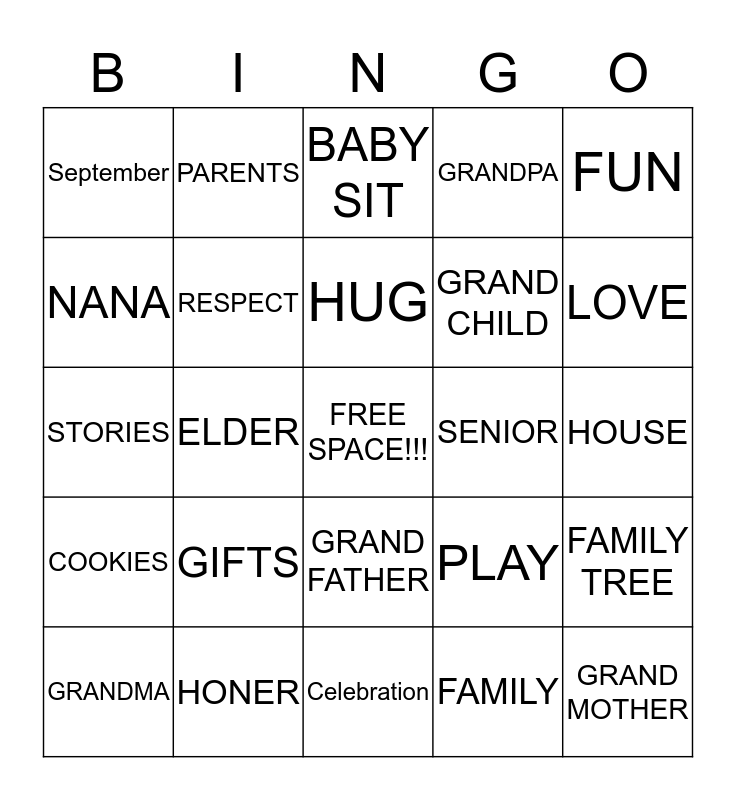 This bingo card has a free space and 24 words: GIFTS, HONER, HUG, GRANDMA, FUN, September, NANA, PARENTS, SENIOR, GRAND FATHER, GRAND CHILD, STORIES, PLAY, FAMILY TREE, RESPECT, FAMILY, HOUSE, BABY SIT, LOVE, ELDER, GRAND MOTHER, COOKIES, GRANDPA and Celebration.