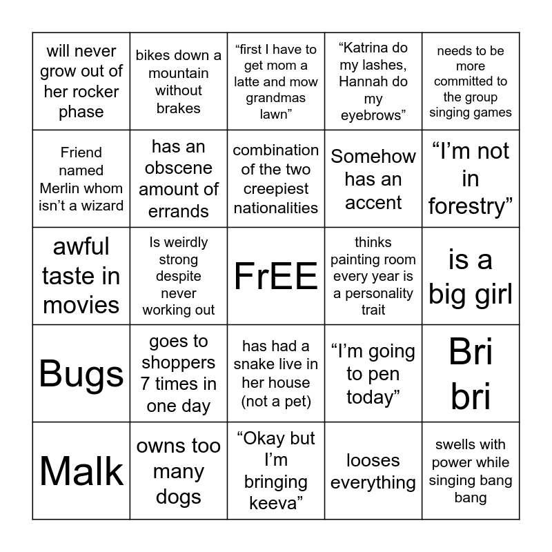 This bingo card has a free space and 24 words: goes to shoppers 7 times in one day, owns too many dogs, combination of the two creepiest nationalities, Malk, needs to be more committed to the group singing games, will never grow out of her rocker phase, Friend named Merlin whom isn’t a wizard, bikes down a mountain without brakes, thinks painting room every year is a personality trait, has had a snake live in her house (not a pet), Somehow has an accent, awful taste in movies, “I’m going to pen today”, Bri bri, has an obscene amount of errands, looses everything, is a big girl, “first I have to get mom a latte and mow grandmas lawn”, “I’m not in forestry”, Is weirdly strong despite never working out, swells with power while singing bang bang, Bugs, “Katrina do my lashes, Hannah do my eyebrows” and “Okay but I’m bringing keeva”.