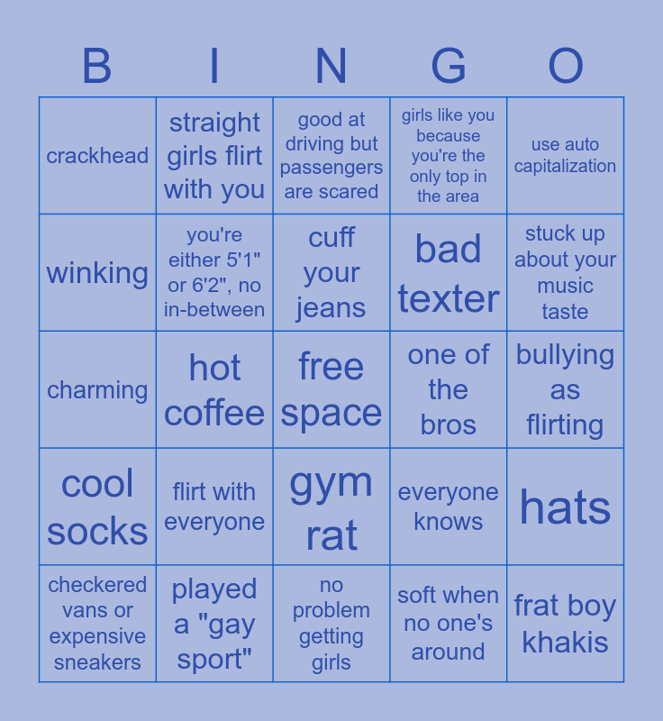 This bingo card has a free space and 24 words: flirt with everyone, played a "gay sport", cuff your jeans, checkered vans or expensive sneakers, use auto capitalization, crackhead, winking, straight girls flirt with you, one of the bros, gym rat, bad texter, charming, everyone knows, hats, you're either 5'1" or 6'2", no in-between, soft when no one's around, bullying as flirting, good at driving but passengers are scared, stuck up about your music taste, hot coffee, frat boy khakis, cool socks, girls like you because you're the only top in the area and no problem getting girls.