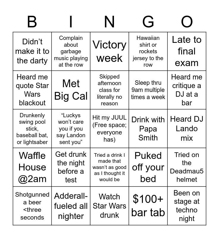 This bingo card has a free space and 24 words: Get drunk the night before a test, Adderall-fueled all nighter, Skipped afternoon class for literally no reason, Shotgunned a beer <three seconds, Late to final exam, Didn’t make it to the darty, Heard me quote Star Wars blackout, Complain about garbage music playing at the row, Drink with Papa Smith, Tried a drink I made that wasn’t as good as I thought it would be, Sleep thru 9am multiple times a week, Drunkenly swing pool stick, baseball bat, or lightsaber, Puked off your bed, Tried on the Deadmau5 helmet, Met Big Cal, $100+ bar tab, Heard DJ Lando mix, Victory week, Heard me critique a DJ at a bar, “Luckys won’t care you if you say Landon sent you”, Been on stage at techno night, Waffle House @2am, Hawaiian shirt or rockets jersey to the row and Watch Star Wars drunk.