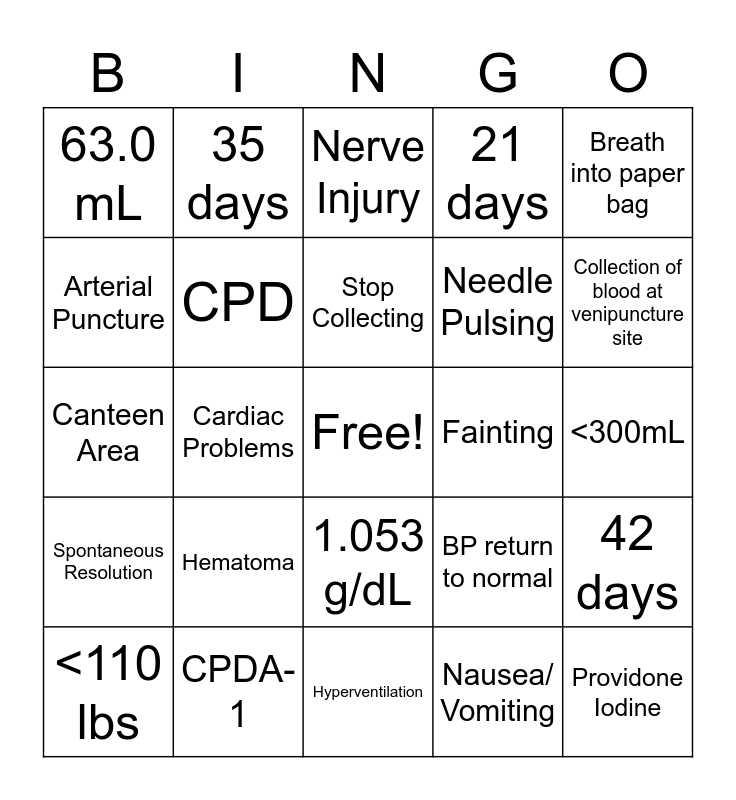 This bingo card has a free space and 24 words: Hematoma, CPDA-1, Stop Collecting, <110 lbs, Breath into paper bag, 63.0 mL, Arterial Puncture, 35 days, Fainting, 1.053 g/dL, Needle Pulsing, Canteen Area, BP return to normal, 42 days, CPD, Nausea/ Vomiting, <300mL, Nerve Injury, Collection of blood at venipuncture site, Cardiac Problems, Providone Iodine, Spontaneous Resolution, 21 days and Hyperventilation.