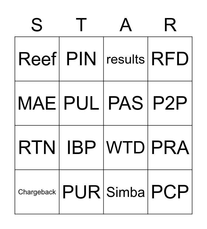 This bingo card has 20 words: PRA, 30, results, PTP, Chargeback, MAE, PUR, Reef, RTN, PIN, IBP, WTD, PUL, PCP, PAS, Free!, P2P, RFD, Simba and SIG.