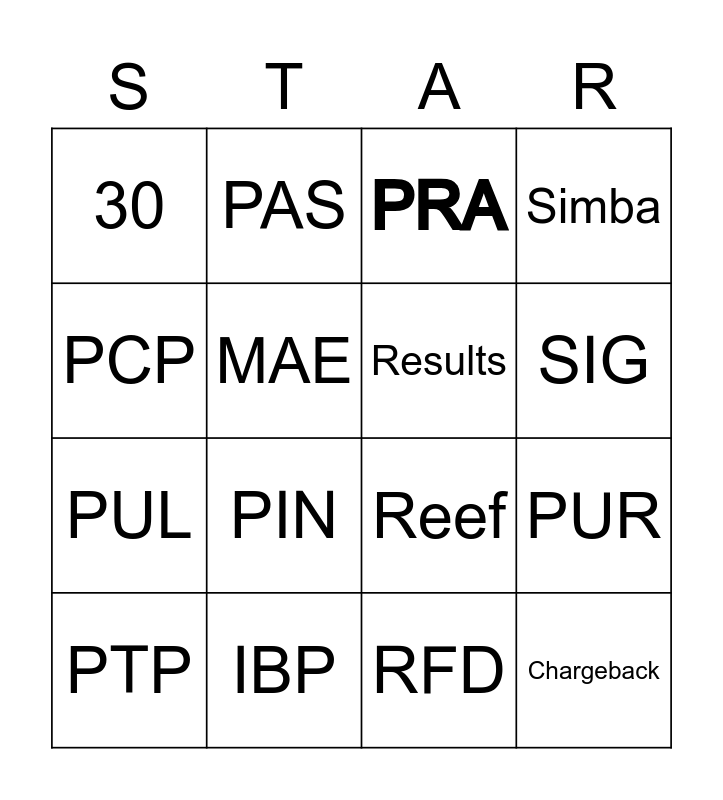 This bingo card has 20 words: PUR, WTD, PRA, RTN, PTP, PCP, IBP, 30, PUL, PAS, PIN, Reef, MAE, Chargeback, Results, Free!, SIG, Simba, RFD and P2P.