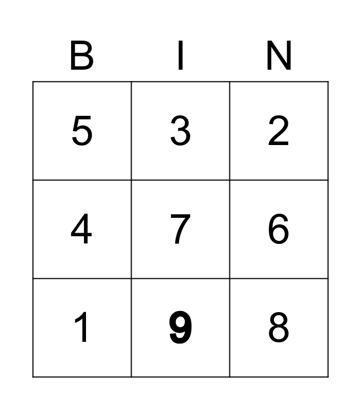 This bingo card has 9 words: 1, 2, 3, 4, 5, 6, 7, 8 and 9.