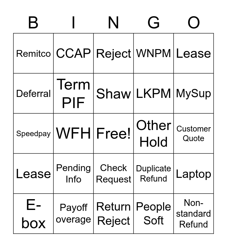 This bingo card has a free space and 34 words: BancTec, People Soft, Payment Uploader, Payoff, Lease, Term PIF, Lease, E-box, CCAP, Indemnity Form, Shaw, Reject, Laser, Excess Payment Refund, Other Hold, MySup, Payoff overage, Speedpay, Pending Info, Duplicate Refund, Check Request, Sales, Remitco, Customer Quote, Return Reject, Non-standard Refund, WNPM, TTLS, LKPM, Deferral, Covid-19, WFH, Laptop and Quarantine.