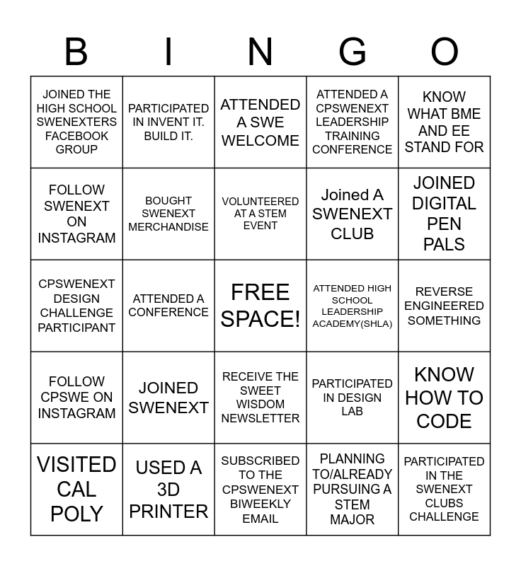 This bingo card has a free space and 24 words: JOINED SWENEXT, USED A 3D PRINTER, VOLUNTEERED AT A STEM EVENT, VISITED CAL POLY, KNOW WHAT BME AND EE STAND FOR, JOINED THE HIGH SCHOOL SWENEXTERS FACEBOOK GROUP, FOLLOW SWENEXT ON INSTAGRAM, PARTICIPATED IN INVENT IT. BUILD IT., ATTENDED HIGH SCHOOL LEADERSHIP ACADEMY(SHLA), RECEIVE THE SWEET WISDOM NEWSLETTER, Joined A SWENEXT CLUB, CPSWENEXT DESIGN CHALLENGE PARTICIPANT, PARTICIPATED IN DESIGN LAB, KNOW HOW TO CODE, BOUGHT SWENEXT MERCHANDISE, PLANNING TO/ALREADY PURSUING A STEM MAJOR, REVERSE ENGINEERED SOMETHING, ATTENDED A SWE WELCOME, JOINED DIGITAL PEN PALS, ATTENDED A CONFERENCE, PARTICIPATED IN THE SWENEXT CLUBS CHALLENGE, FOLLOW CPSWE ON INSTAGRAM, ATTENDED A CPSWENEXT LEADERSHIP TRAINING CONFERENCE and SUBSCRIBED TO THE CPSWENEXT BIWEEKLY EMAIL.