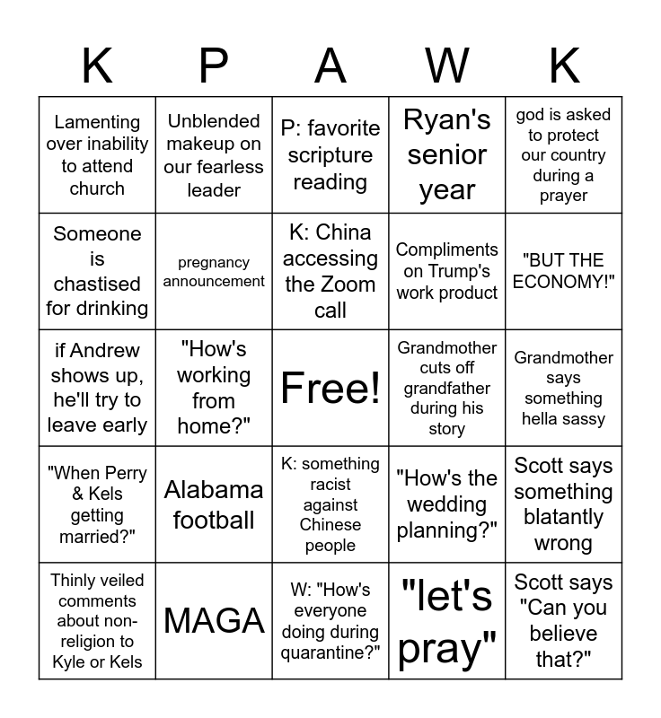 This bingo card has a free space and 24 words: Thinly veiled comments about non-religion to Kyle or Kels, Alabama football, K: China accessing the Zoom call, "let's pray", god is asked to protect our country during a prayer, Lamenting over inability to attend church, Unblended makeup on our fearless leader, P: favorite scripture reading, Grandmother cuts off grandfather during his story, Grandmother says something hella sassy, if Andrew shows up, he'll try to leave early, pregnancy announcement, "How's the wedding planning?", Scott says something blatantly wrong, Someone is chastised for drinking, MAGA, W: "How's everyone doing during quarantine?", Ryan's senior year, "BUT THE ECONOMY!", "When Perry & Kels getting married?", "How's working from home?", K: something racist against Chinese people, Compliments on Trump's work product and Scott says "Can you believe that?".