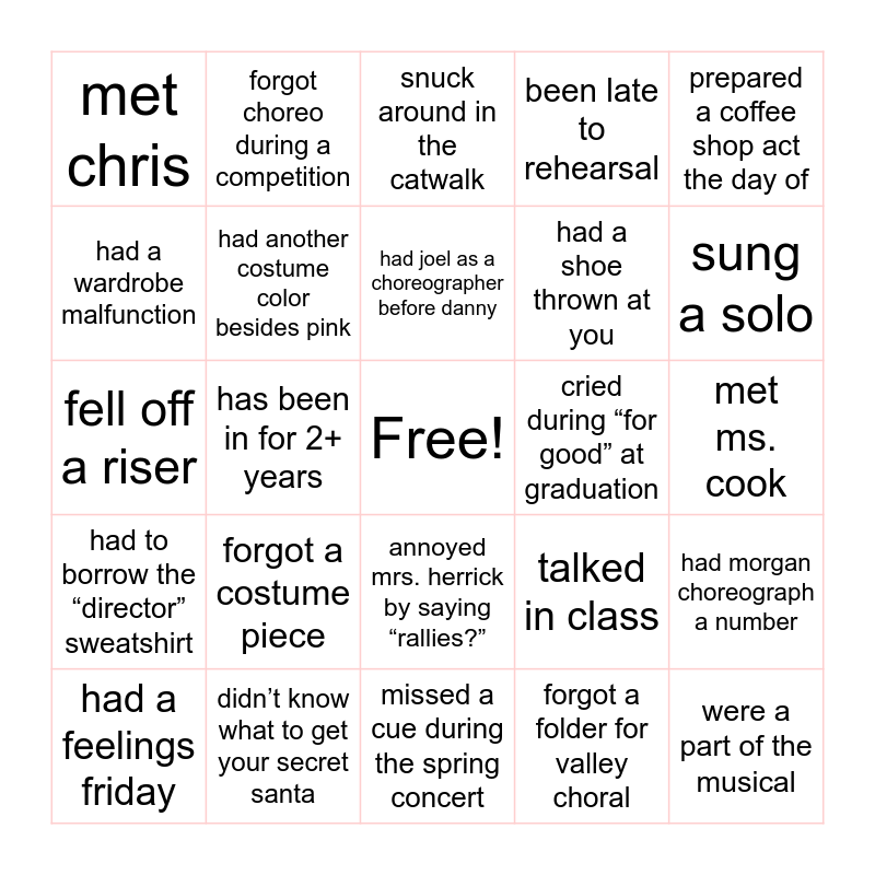 This bingo card has a free space and 24 words: forgot a costume piece, didn’t know what to get your secret santa, had joel as a choreographer before danny, had a feelings friday, prepared a coffee shop act the day of, met chris, had a wardrobe malfunction, forgot choreo during a competition, cried during “for good” at graduation, annoyed mrs. herrick by saying “rallies?”, had a shoe thrown at you, fell off a riser, talked in class, had morgan choreograph a number, had another costume color besides pink, forgot a folder for valley choral, met ms. cook, snuck around in the catwalk, sung a solo, has been in for 2+ years, were a part of the musical, had to borrow the “director” sweatshirt, been late to rehearsal and missed a cue during the spring concert.