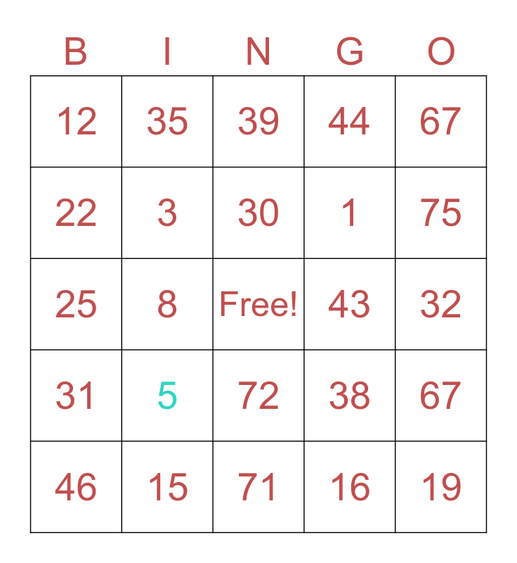 This bingo card has a free space and 24 words: 5, 15, 30, 46, 67, 12, 22, 35, 43, 72, 1, 25, 38, 67, 3, 16, 32, 39, 75, 8, 19, 31, 44 and 71.