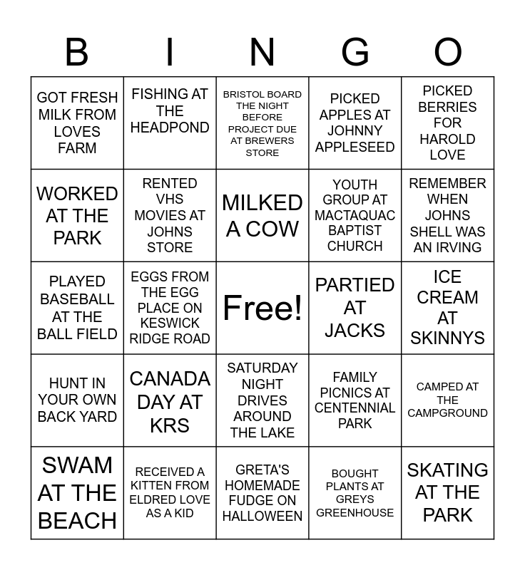 This bingo card has a free space and 24 words: CANADA DAY AT KRS, RECEIVED A KITTEN FROM ELDRED LOVE AS A KID, MILKED A COW, SWAM AT THE BEACH, PICKED BERRIES FOR HAROLD LOVE, GOT FRESH MILK FROM LOVES FARM, WORKED AT THE PARK, FISHING AT THE HEADPOND, PARTIED AT JACKS, SATURDAY NIGHT DRIVES AROUND THE LAKE, YOUTH GROUP AT MACTAQUAC BAPTIST CHURCH, PLAYED BASEBALL AT THE BALL FIELD, FAMILY PICNICS AT CENTENNIAL PARK, CAMPED AT THE CAMPGROUND, RENTED VHS MOVIES AT JOHNS STORE, BOUGHT PLANTS AT GREYS GREENHOUSE, ICE CREAM AT SKINNYS, BRISTOL BOARD THE NIGHT BEFORE PROJECT DUE AT BREWERS STORE, REMEMBER WHEN JOHNS SHELL WAS AN IRVING, EGGS FROM THE EGG PLACE ON KESWICK RIDGE ROAD, SKATING AT THE PARK, HUNT IN YOUR OWN BACK YARD, PICKED APPLES AT JOHNNY APPLESEED and GRETA'S HOMEMADE FUDGE ON HALLOWEEN.