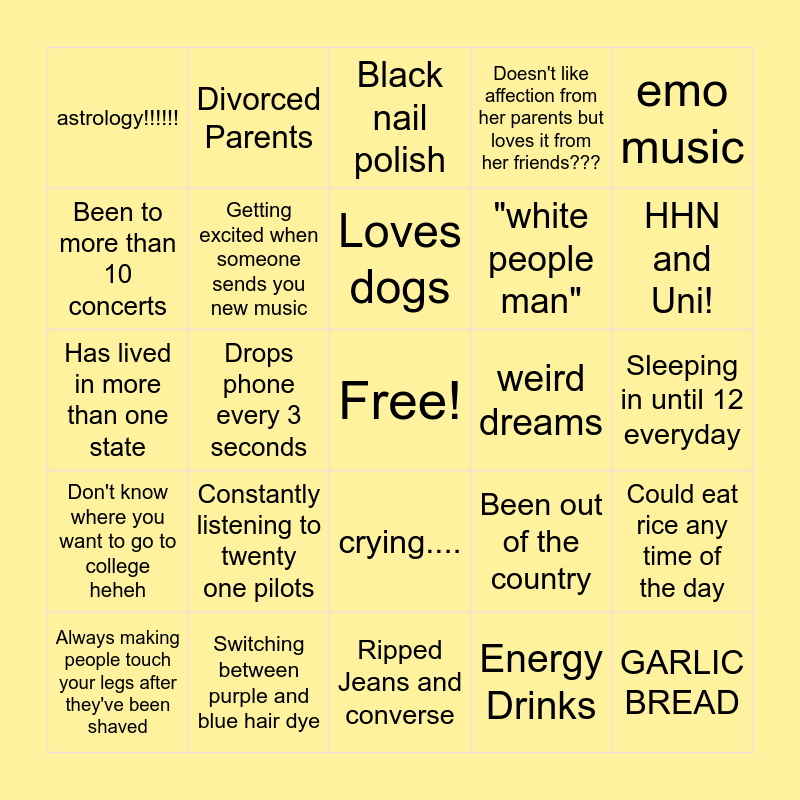 This bingo card has a free space and 24 words: Constantly listening to twenty one pilots, Switching between purple and blue hair dye, Loves dogs, Always making people touch your legs after they've been shaved, emo music, astrology!!!!!!, Been to more than 10 concerts, Divorced Parents, weird dreams, crying...., "white people man", Has lived in more than one state, Been out of the country, Could eat rice any time of the day, Getting excited when someone sends you new music, Energy Drinks, Sleeping in until 12 everyday, Black nail polish, HHN and Uni!, Drops phone every 3 seconds, GARLIC BREAD, Don't know where you want to go to college heheh, Doesn't like affection from her parents but loves it from her friends??? and Ripped Jeans and converse.