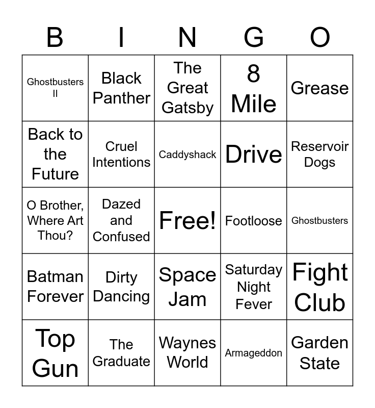 This bingo card has a free space and 34 words: A Star is Born, Armageddon, Purple Rain, Pulp Fiction, Batman Forever, Cruel Intentions, Grease, Top Gun, Black Panther, Titanic, Caddyshack, The Great Gatsby, Suicide Squad, Guardians of the Galaxy, Footloose, Reservoir Dogs, The Graduate, O Brother, Where Art Thou?, Dirty Dancing, Saturday Night Fever, Space Jam, The Breakfast Club, Ghostbusters II, Ghostbusters, Waynes World, Garden State, 8 Mile, Donnie Darko, Drive, Back to the Future, Ferris Buellers Day Off, Dazed and Confused, Fight Club and Spider-Man: Into the Spider-Verse.