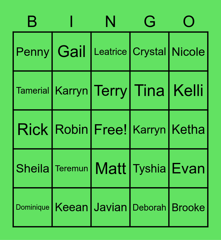 This bingo card has a free space and 34 words: Gwen, Deborah, Delores, Mildred, Sheila, Karryn, Nicole, Dominique, Gail, Luwarner, Terry, Leatrice, Mable, Cathy, Karryn, Kelli, Keean, Rick, Teremun, Tyshia, Matt, JaJuan, Penny, Ketha, Javian, Brooke, Crystal, TeeTee, Tina, Tamerial, Bre, Robin, Evan and Kristian.