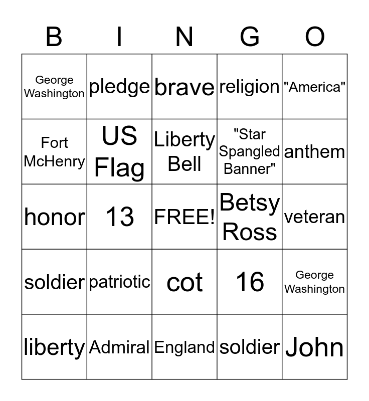 This bingo card has a free space and 24 words: patriotic, Admiral, Liberty Bell, liberty, "America", George Washington, Fort McHenry, pledge, Betsy Ross, cot, "Star Spangled Banner", honor, 16, George Washington, US Flag, soldier, veteran, brave, anthem, 13, John, soldier, religion and England.