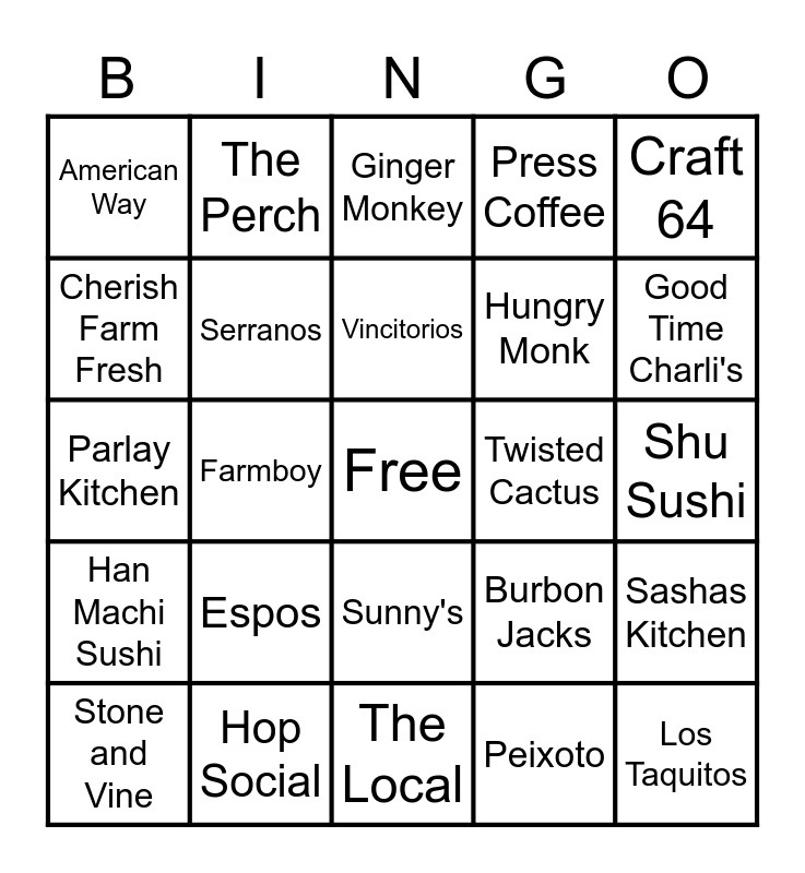This bingo card has a free space and 24 words: Espos, Hop Social, Vincitorios, Stone and Vine, Craft 64, American Way, Cherish Farm Fresh, The Perch, Twisted Cactus, Sunny's, Hungry Monk, Parlay Kitchen, Burbon Jacks, Sashas Kitchen, Serranos, Peixoto, Shu Sushi, Ginger Monkey, Good Time Charli's, Farmboy, Los Taquitos, Han Machi Sushi, Press Coffee and The Local.
