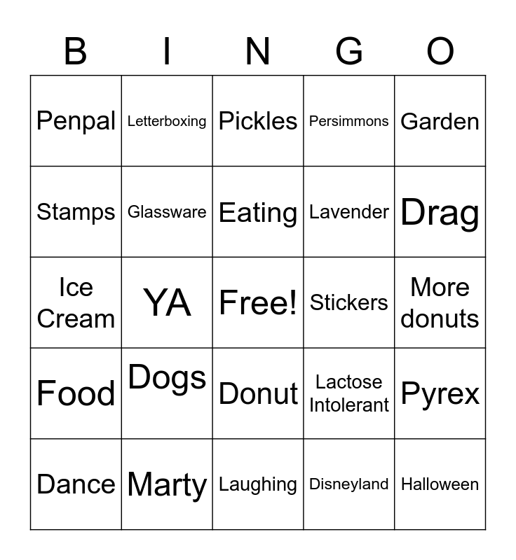 This bingo card has a free space and 24 words: Dogs, Marty, Eating, Dance, Garden, Penpal, Stamps, Letterboxing, Stickers, Donut, Lavender, Ice Cream, Lactose Intolerant, Pyrex, Glassware, Disneyland, More donuts, Pickles, Drag, YA, Halloween, Food, Persimmons and Laughing.
