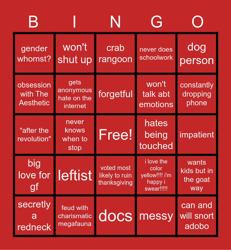 This bingo card has a free space and 24 words: leftist, feud with charismatic megafauna, forgetful, secretly a redneck, dog person, gender whomst?, obsession with The Aesthetic, won't shut up, hates being touched, voted most likely to ruin thanksgiving, won't talk abt emotions, "after the revolution", i love the color yellow!!!! i'm happy i swear!!!!!, wants kids but in the goat way, gets anonymous hate on the internet, messy, impatient, crab rangoon, constantly dropping phone, never knows when to stop, can and will snort adobo, big love for gf, never does schoolwork and docs.