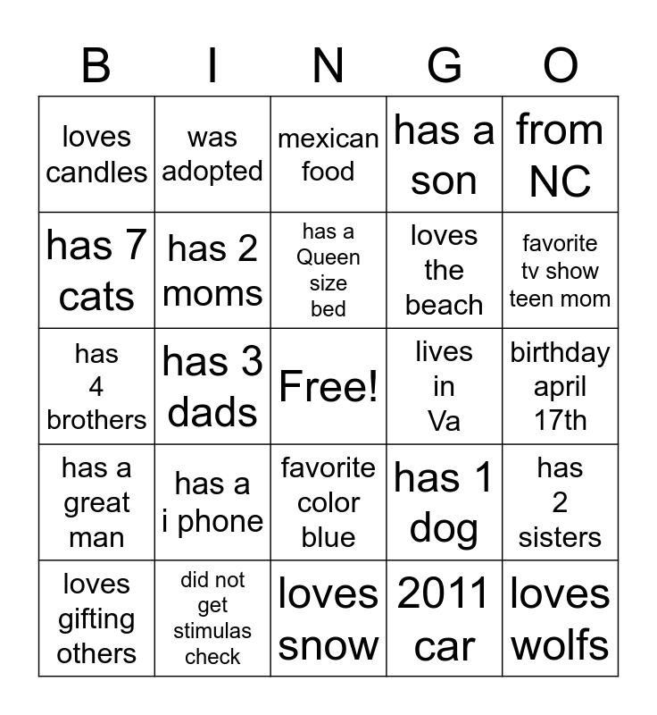 This bingo card has a free space and 24 words: has a i phone, did not get stimulas check, has a Queen size bed, loves gifting others, from NC, loves candles, has 7 cats, was adopted, lives in Va, favorite color blue, loves the beach, has 4 brothers, has 1 dog, has 2 sisters, has 2 moms, 2011 car, birthday april 17th, mexican food, favorite tv show teen mom, has 3 dads, loves wolfs, has a great man, has a son and loves snow.