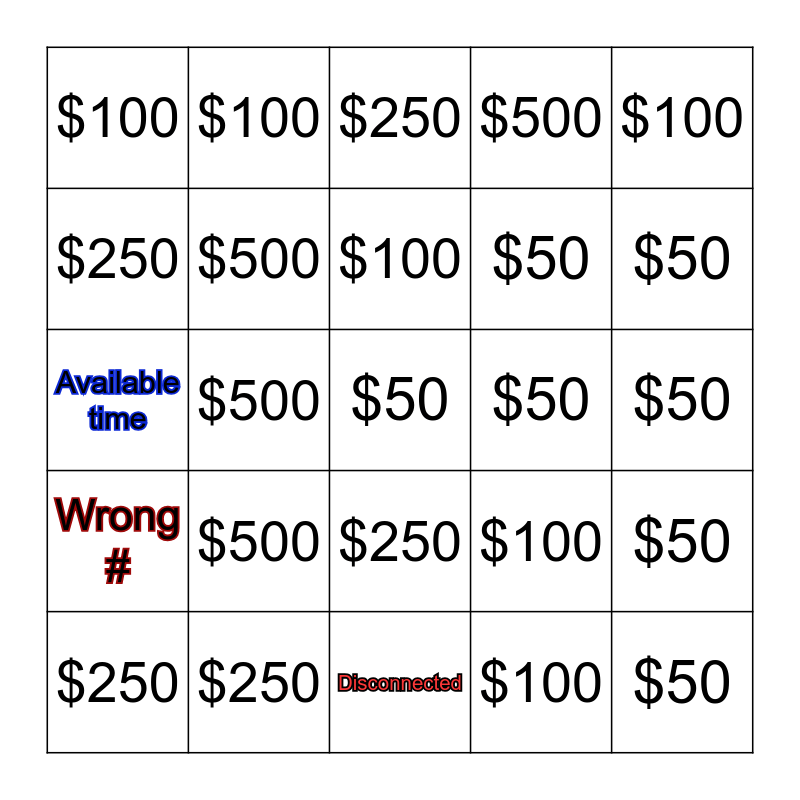 This bingo card has 57 words: $50, $250, No Answer, $100, Disconnected, Wrong #, $500, Keep Dialing, $50, No longer drive, $500, $250, $100, $500, $50, Not Home, $100, $500, Not Ready, $50, $50, $250, $100, $250, Busy, $100, Have with my Ins, $100, $50, Busy, $500, $100, $250, $500, $50, $250, $100, Available time, $250, Wrong #, $100, $250, $50, $500, $500, $50, $500, $250, Out of Srv, $100, $50, $100, Can't Afford, $250, $500, $50 and Decline.
