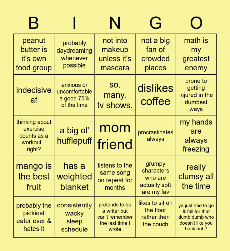 This bingo card has a free space and 24 words: has a weighted blanket, consistently wacky sleep schedule, so. many. tv shows., probably the pickiest eater ever & hates it, math is my greatest enemy, peanut butter is it's own food group, indecisive af, probably daydreaming whenever possible, procrastinates always, listens to the same song on repeat for months, dislikes coffee, thinking about exercise counts as a workout... right?, grumpy characters who are actually soft are my fav, really clumsy all the time, anxious or uncomfortable a good 75% of the time, likes to sit on the floor rather then the couch, my hands are always freezing, not into makeup unless it's mascara, prone to getting injured in the dumbest ways, a big ol' hufflepuff, ya just had to go & fall for that dumb dumb who doesn't like you back huh?, mango is the best fruit, not a big fan of crowded places and pretends to be a writer but can't remember the last time I wrote.
